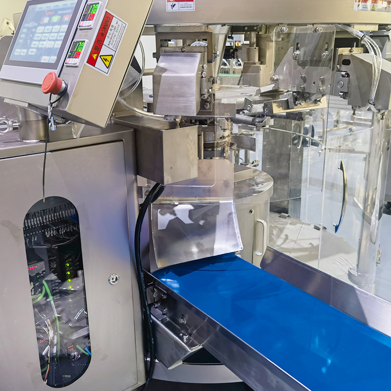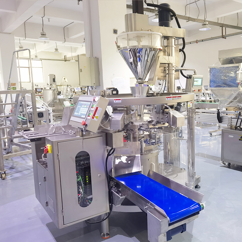 八工位粉劑包裝機的工(gōng)作方式極為智能(néng)靈活,工作人員在經過參數設定後,設備能夠在自動模式下,無縫銜接的配合上下遊自動化設備執行包裝任務,給袋式包(bāo)裝設備的工作方式是操作人(rén)員設定好所有工作參數(shù)後,由給袋裝置自動抓取輸(shū)送至(zhì)開袋處,經過開袋智能檢測係統,自動將包(bāo)裝袋呈現出打開的狀態,八工位粉劑包裝機若是檢測到無袋或者不開(kāi)袋等情況狀態下,下料動(dòng)作會自動(dòng)停止。在一切正常的狀態下,物料會按照工作人員設定的包裝重量進行充填(tián),並保(bǎo)證每袋商品充填量的一致性輸出。充填完(wán)成(chéng)後(hòu),袋子被(bèi)輸送至封口工位進行封口處理,隨後經(jīng)過噴碼、整形等(děng)工序(xù)。