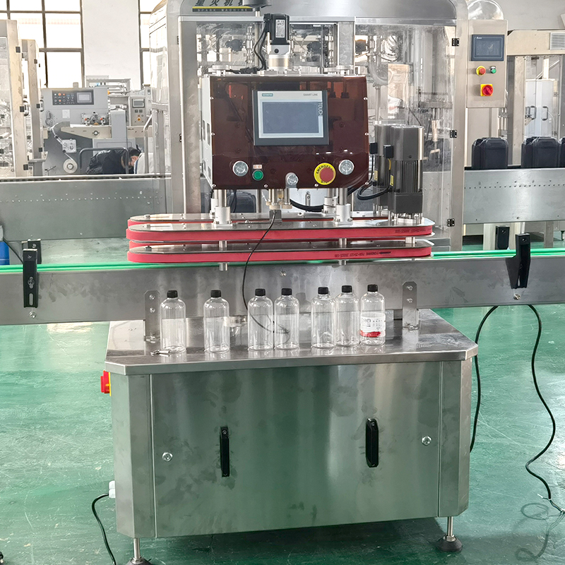 3、旋蓋:全自動直線式夾蓋機的旋蓋部分采用啟動馬(mǎ)達,帶動鎖蓋輪旋轉,完成(chéng)旋蓋操作。